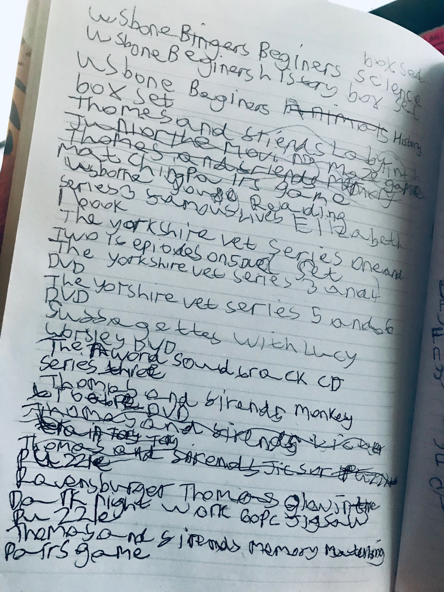Before that, we’re making a start on one of the 89 episodes of the surprise present I got her: the complete DVD box set of the original All Creatures Great And Small. It wasn't actually on her...shall we say...quite detailed and extensive birthday list (see photo below). Going ‘off-list’ isn’t always advisable and neither is me accidentally getting her the wrong edition of the Usborne Elizabeth 1 book, but that’s a whole other story. However, she’s mad on the new remake of the 70s TV programme so I took a punt - and it paid off. She's shaking with excitement at seeing the original cows’ arses that James Herriot stuck his arm up.